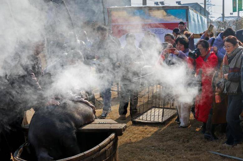 1月24日上午,来安县新安镇孙桥村的石缘院子度假轰趴馆的草坪上,早已是一派热闹景象。柴火在灶膛里噼啪作响,熊熊火焰舔舐着锅底,大铁锅中的水花翻滚沸腾,热气氤氲。“年猪起——!”随着一声洪亮的吆喝,三位壮汉默契配合,一人揪耳、一人抱尾、一人按蹄,如同抬轿子般稳稳将三百多斤重的黑毛猪摁在条凳上。杀猪匠利落完成宰杀后,将猪投入滚烫的开水中,瞬间腾起阵阵白气——这是皖东人家过年最隆重的“打猪衁”仪式,热气腾腾的场景里,藏着乡亲们对来年红红火火的期盼。