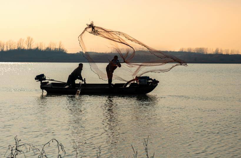 孙桥村鱼塘养殖户正在撒网捕鱼。韩琦富摄